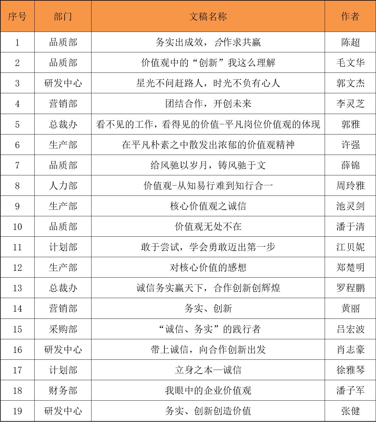 首先,評審組10位評委根據價值觀主題、文稿內容,觀點表達清晰度,事實案例,語言表達流暢,文稿整體結構完整性,幾個方面對稿件進行了認真的打分,再依據分值排名匯總至執行總裁最終審核,得出最終評審結果:品質部陳超的稿件《務實出成效,合作求共贏》緊扣征文主題,內容充實,結合實際,贏得各位評委的一致好評,一舉奪得本次征文活動的一等獎。品質部毛文華的稿件《價值觀中的“創新”我這么理解》、研發中心郭文杰的稿件《星光不問趕路人,時光不負有心人》獲得本次征文的二等獎,兩篇從不同角度述了創新理念,只有做到敢于創新,才能在激烈的市場競爭中脫穎而出;營銷部李靈芝的稿件《團結合作,開創未來》、總裁辦郭雅的稿件《看不見的工作,看得見的價值-平凡崗位價值觀的體現》獲得三等獎。